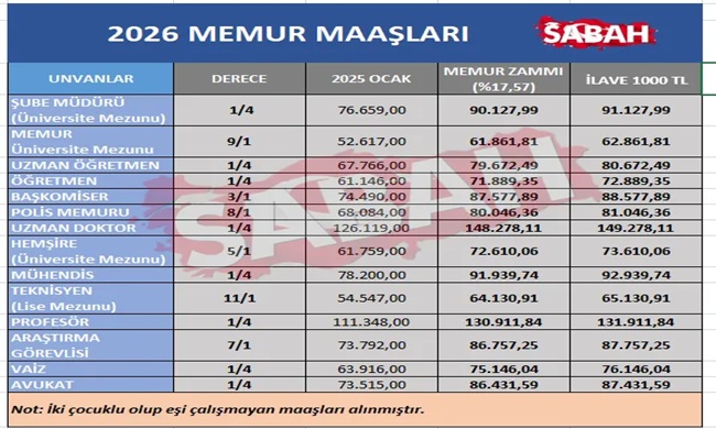 1.000 TL’lik ilave sonrasında en düşük memur maaşı 60 bin 376 liraya, en düşük memur emeklisi maaşı ise 27 bin 654 liraya yükselecek.