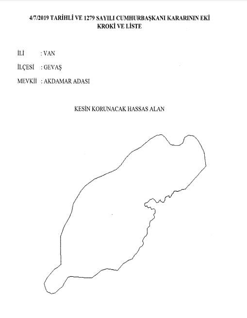 Van’ın Gevaş İlçesi sınırları içinde yer alan, tarihi Akdamar Kilisesi ile ünlü Akdamar Adası, Cumhurbaşkanı kararı ile ‘Kesin Korunacak Hassas Alan’ ilan edildi. Cumhurbaşkanı Recep Tayyip Erdoğan imzalı ve 1279 sayılı Van İli, Gevaş İlçesinde Bulunan Akdamar Adası Doğal Sit Alanının Koruma Statüsünün Yeniden Değerlendirilmesi Sonucunda, Bazı Alanın Kesin Korunacak Hassas Alan Olarak Tescil ve İlan Edilmesi Hakkında Karar, bugün (5 Temmuz 2019, Cuma) tarih ve 30822 sayılı Resmi Gazete’de yayımlandı.