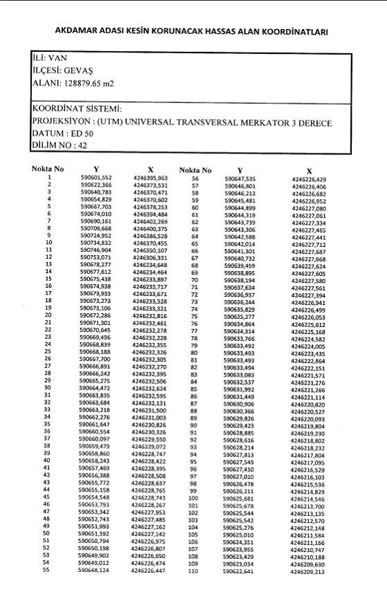 Van’ın Gevaş İlçesi’nde bulunan ve 128 bin 879.65 metrekare yüzölçümüne sahip Akdamar Adası hakkındaki karar ile sınır ve koordinatlar şöyle;