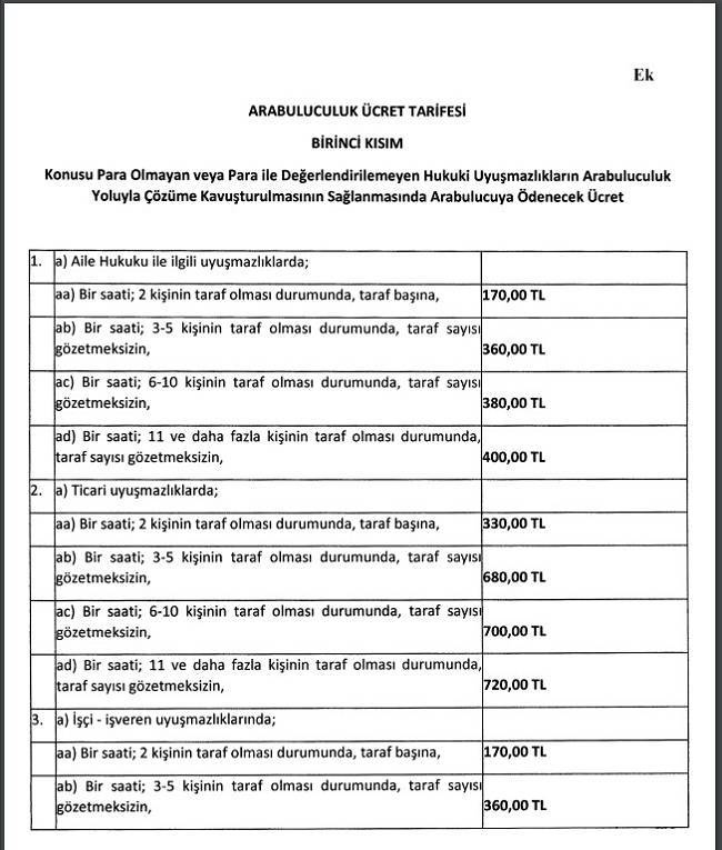 MADDE 7 – (1) Konusu para olmayan veya para ile değerlendirilemeyen hukuki uyuşmazlıklarda; arabuluculuk ücreti bu Tarifenin eki Arabuluculuk Ücret Tarifesinin Birinci Kısmına göre belirlenir.