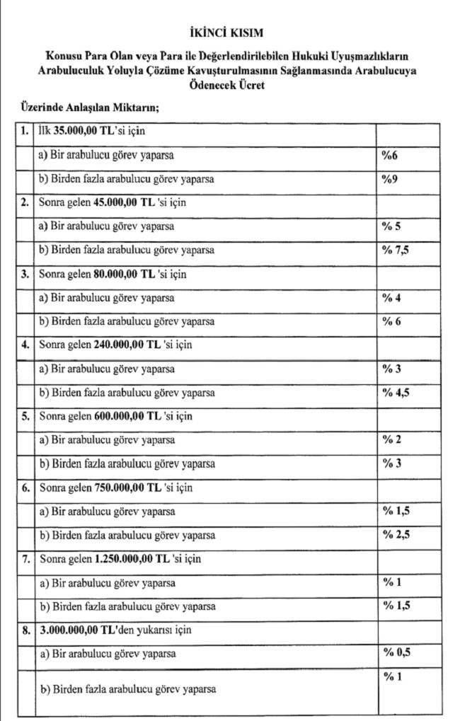 (2) Konusu para olan veya para ile değerlendirilebilen hukuki uyuşmazlıklarda; arabuluculuk ücreti bu Tarifenin eki Arabuluculuk Ücret Tarifesinin İkinci Kısmına göre belirlenir.