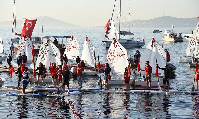 Karadan, denizden ve havadan Türk bayrakları ve Atatürk posterlerinin açıldığı etkinlikte, Kadıköy’de faaliyet gösteren spor kulüpleri de yer aldı.