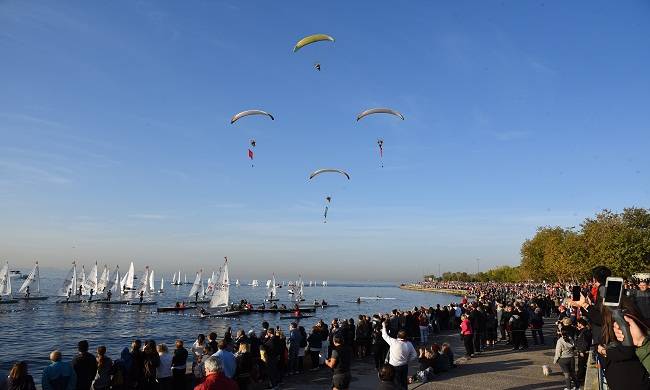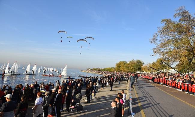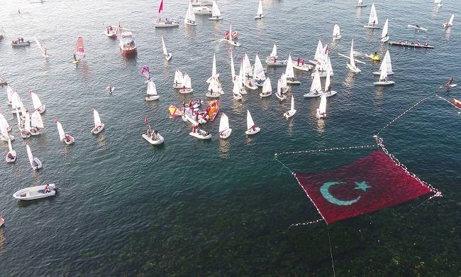 Paramotorların havada Türk bayrakları ve Atatürk posteri açtığı törende, deniz içinde de dev bayraklar açıldı.