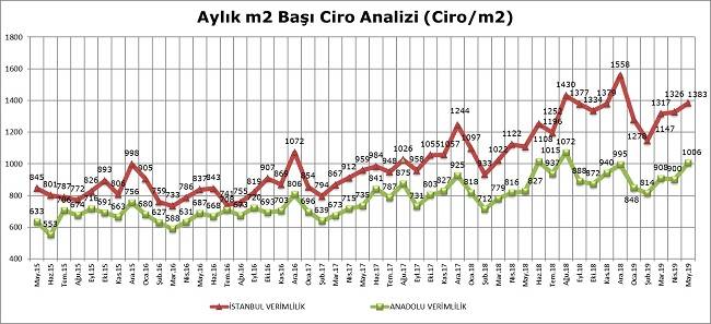 AVM’lerde kiralanabilir alan (m2) başına düşen cirolar Mayıs 2019’da İstanbul’da 1.383 TL, Anadolu’da 1.006 TL olurken Türkiye geneli m2 verimliliği ise Mayıs 2019’de 1.157 TL olarak gerçekleşti.