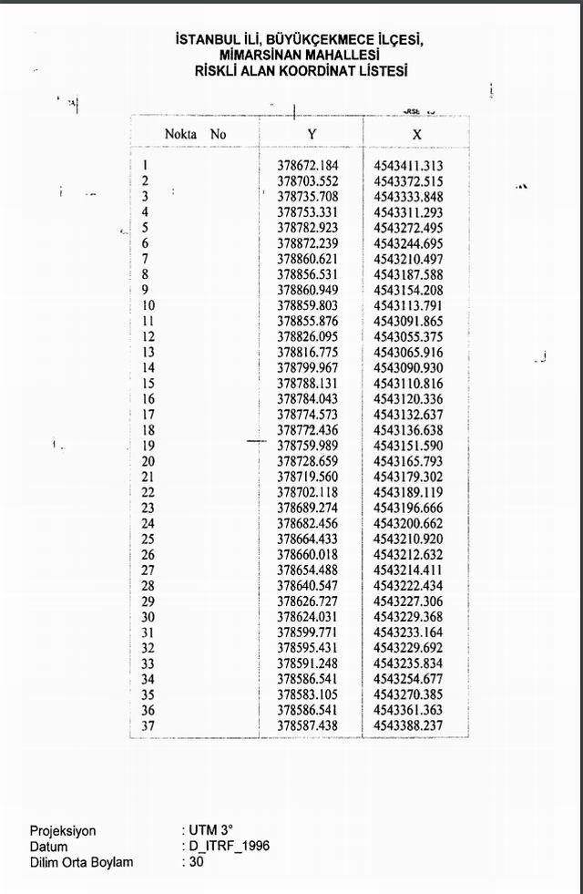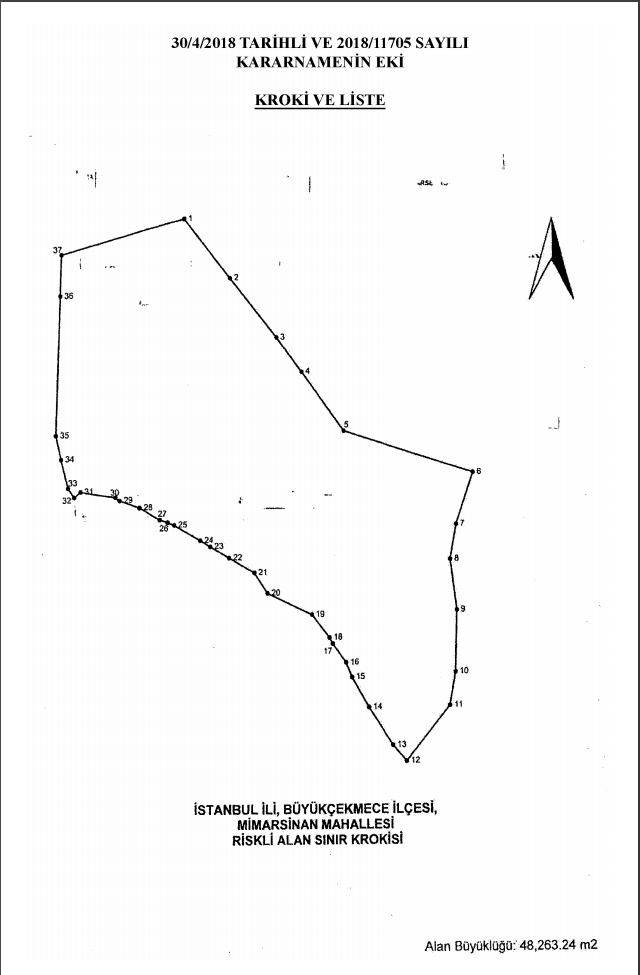 “İstanbul İli, Büyükçekmece İlçesi, Mimarsinan Mahallesi sınırları içerisinde bulunan ve ekli kroki ile listede sınır ve koordinatları gösterilen alanın riskli alan ilan edilmesi; Çevre ve Şehircilik Bakanlığı’nın 9/4/2018 tarihli ve 63085 sayılı yazısı üzerine, 6306 sayılı Afet Riski Altındaki Alanların Dönüştürülmesi Hakkında Kanun’un 2’inci ve ek 1’inci maddelerine göre, Bakanlar Kurulu’nca 30/4/2018 tarihinde kararlaştırılmıştır.”