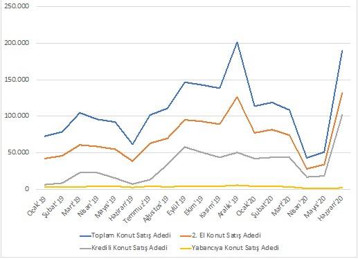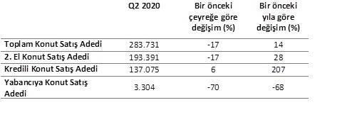 2020 yılının 2. çeyreğinde 283.731 adet konut satışı gerçekleşti. Konut satış adedi bir önceki çeyreğe göre %17 düşüş; 2019 yılının 2. çeyreğine göre ise %14 artış göstermiş oldu. 2. çeyrekte 193.391 adet ikinci el konut satışı, 137.075 adet kredili konut satışı gerçekleşti. Geçen senenin 2. çeyreğine göre ikinci el konut satışları %28, kredili konut satışları ise %207 artış göstermiş oldu.
