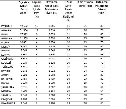 En fazla konut satışı yapılan illerdeki ortalama fiyat, değer değişimi, pazarlama ve amortisman süresi
