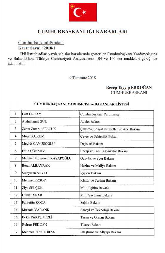 Cumhurbaşkanlığı Yardımcılığına ve Bakanlıklara Yapılan Atamalar Hakkında Karar (Karar Sayısı: 2018/1)