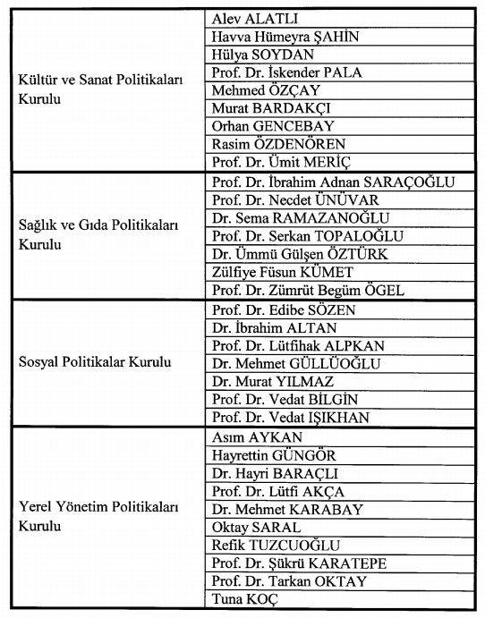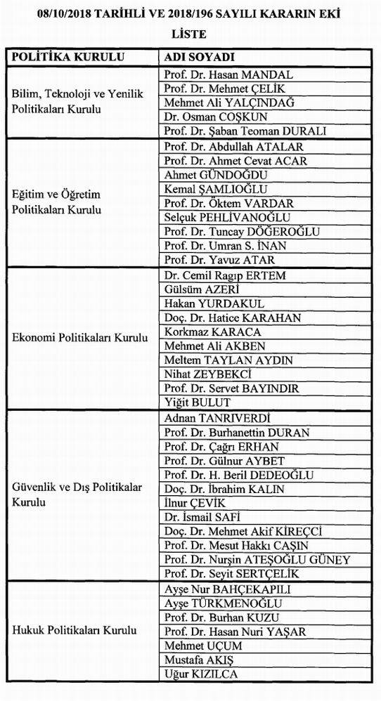 “Cumhurbaşkanlığı politika kurulları üyeliklerine, Cumhurbaşkanlığı Teşkilatı Hakkında Cumhurbaşkanlığı Kararnamesi’nin 21 inci maddesi gereğince ekli listede yer alan kişiler atanmıştır.”