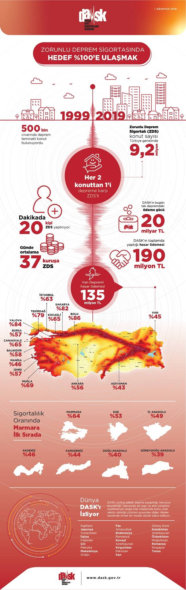 Bugün Türkiye’de her iki konuttan biri Zorunlu Deprem Sigortası ile güvence altında. Sigortalılık oranı en yüksek iller arasında özellikle deprem geçirmiş iller yer alıyor. Yalova, Sakarya ve Bolu’da sigortalılık oranları yüzde 80’i aşarken, İstanbul’da ise yüzde 63’e ulaşmış durumda.
