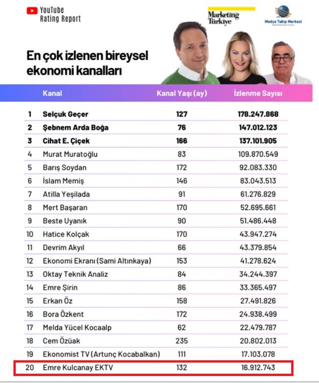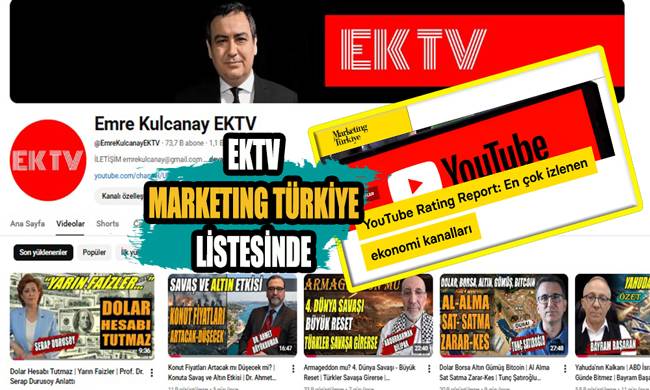 Dijital yayıncılığın nabzını tutan Marketing Türkiye ve MTM Medya Takip Merkezi iş birliğiyle hazırlanan “YouTube Rating Report” sonuçları açıklandı. Ekonomi kategorisinde Türkiye’nin en çok izlenen kanallarının listelendiği raporda, gazeteci Emre Kulcanay yönetimindeki YouTube Emre Kulcanay EK TV, “En Çok İzlenen Bireysel Ekonomi Kanalları” listesine 20. sıradan giriş yaparak büyük bir sürprize imza attı.