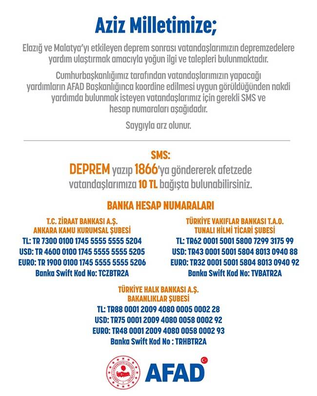 Cumhurbaşkanlığımız tarafından vatandaşlarımızın yapacağı yardımların AFAD Başkanlığınca koordine edilmesi uygun görüldüğünden, yardım yapma taleplerini karşılayacak SMS ve hesap numaraları bulunmaktadır. Vatandaşlarımız, tüm GSM operatörlerinden DEPREM yazıp 1866’ya SMS göndererek afetzedeler için 10 TL bağışta bulunabilmektedir. Ayrıca Ziraat Bankası, Vakıflar Bankası ve Halk Bankası ile PTTBank’ın aşağıdaki hesap numaralarına istedikleri tutarda yardım yapabilir.
