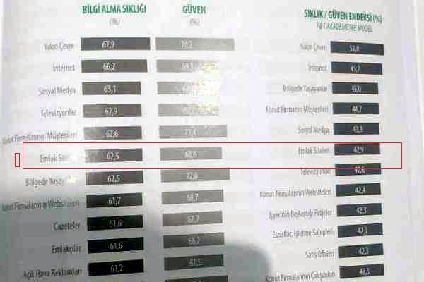 Yapılan araştırma sonucu; Oransan çoğunluk gayrimenkul projeleri ile ilgili en fazla yakın çevreden aldıkları bilgiye güven duyuyor. Emlak Haber Siteleri yeni medyanın en önemli bilgi kanalı haline geldiği görülüyor.