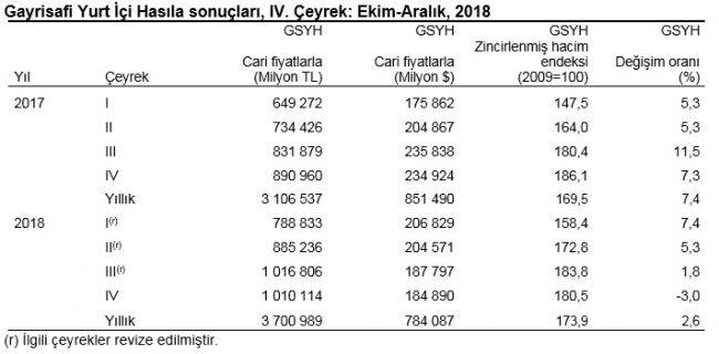 Gayrisafi Yurt İçi Hasıla dördüncü çeyrek ilk tahmini; zincirlenmiş hacim endeksi olarak (2009=100), 2018 yılının dördüncü çeyreğinde bir önceki yılın aynı çeyreğine göre %3 azaldı.