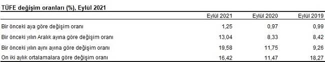 TÜFE’de (2003=100) 2021 yılı Eylül ayında bir önceki aya göre yüzde 1.25, bir önceki yılın Aralık ayına göre yüzde 13.04, bir önceki yılın aynı ayına göre yüzde 19.58 ve on iki aylık ortalamalara göre yüzde 16.42 artış gerçekleşti.