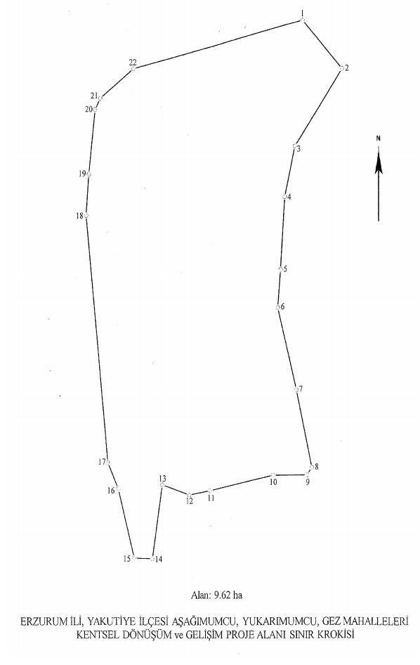 MADDE 1- (1) Erzurum İli, Yakutiye İlçesi, Aşağımumcu, Yukarımumcu ve Gez mahalleleri sınırları içerisinde bulunan ve ekli kroki ile listede sınır ve koordinatları gösterilen alan, kentsel dönüşüm ve gelişim proje alanı ilan edilmiştir.