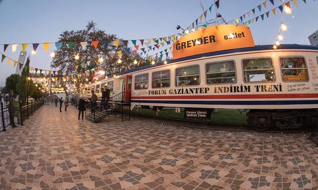 “İndirim Treni” – Forum Gaziantep: Forum Gaziantep restore ederek satış istasyonuna dönüştürdüğü 1987 model vagonun içerisinde indirimli ve outlet ürünlerin satışını yaparak nostaljik motiflerle modern alışveriş kültürünü bir araya getirdi.
