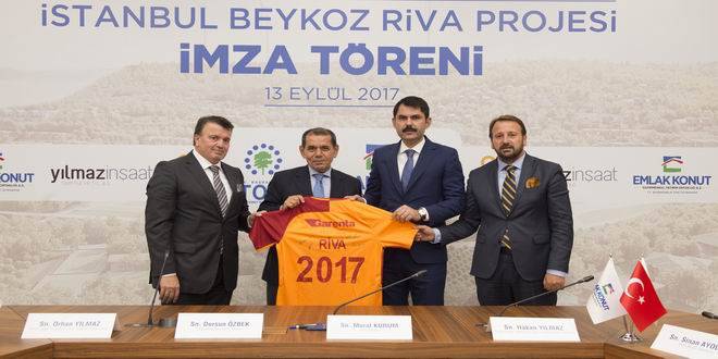 İmza töreninde konuşan Galatasaray Spor Kulübü Başkanı Dursun Özbek ise: “Galatasaray Spor Kulübümüze ait Riva’daki arazimizi Emlak Konut ile geliştirmek üzere daha önce bir protokol yapmıştık. Emlak Konut ihaleyi başarıyla gerçekleştirdi ve bugün ihalenin kazananı Yılmaz İnşaat ile proje için imzaları atıyoruz. Galatasaray Spor Kulübüne büyük fayda sağlayacak bu projenin hem ülkemize hem böyle büyük bir taahhüt altına giren Yılmaz İnşaat’a ve Emlak Konut’a hayırlı olmasını diliyorum. Allah utandırmasın. Ülkemize fayda getirmesi açısında önemli olacağına inandığımız bu projede kendilerine başarılar diliyorum.” dedi.