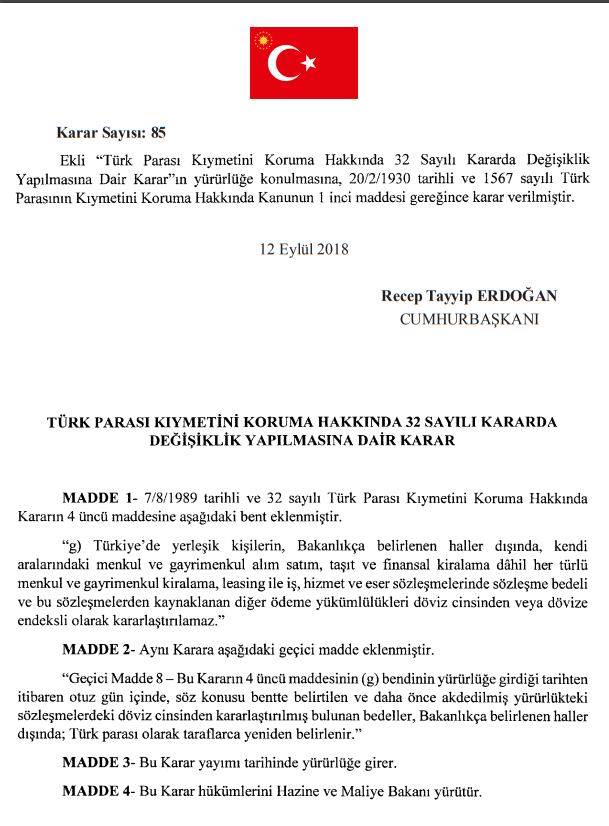 İşte bugün (13 Eylül 2018, Perşembe) tarih ve 30534 Sayılı Resmi Gazete’de yayımlanarak yürürlüğe giren Türk Parası Kıymetini Korumu Hakkında 32 Sayılı Kararda Değişiklik Yapılmasına Dair Karar (Karar Sayısı: 85)…