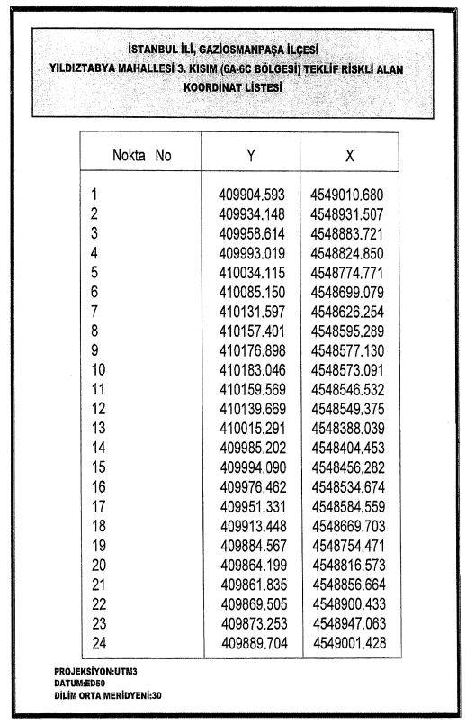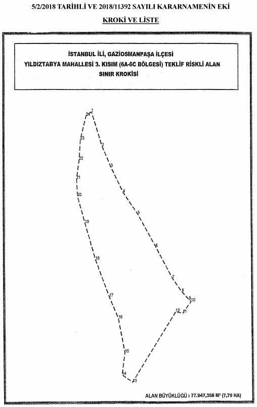 Bakanlar Kurulu’nun Gaziosmanpaşa Yıldıztabya 3. Kısım sınırları içinde bulunan bölgenin riskli alan ilan edilmesi kararı bugünkü Resmi Gazete’de yayımlandı. İşte o bölge krokisi ve koordinatları…
