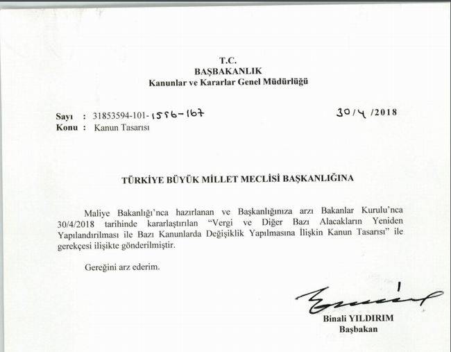 Maliye Bakanlığı’nca hazırlanan ve Başkanlığınıza arzı Bakanlar Kurulu’nca 30/4/2018 tarihinde kararlaştırılan “Vergi ve Diğer Bazı Alacakların Yeniden Yapılandırılması ile Bazı Kanunlarda Değişiklik Yapılmasına İlişkin Kanun Tasarısı” ile gerekçesi ilişikte gönderilmiştir.