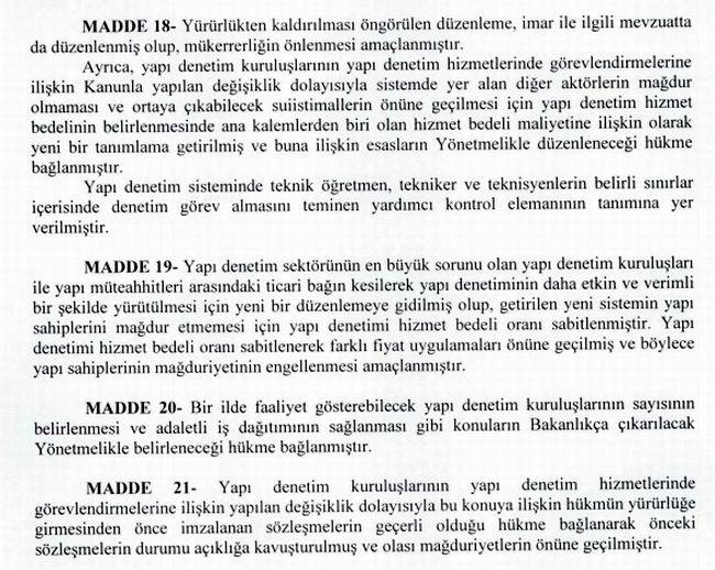 MADDE 19 – Yapı denetim sektörünün en büyük sorunu olan yapı denetim kuruluşları ile yapı müteahhitleri arasındaki ticari bağın kesilerek yapı denetiminin daha etkin ve verimli bir şekilde yürütülmesi için yeni bir düzenlemeye gidilmiş olup, getirilen yeni sistemin yapı sahiplerini mağdur etmemesi için yapı denetimi hizmet bedeli oranı sabitlenmiştir. Yapı denetimi hizmet bedeli oranı sabitlenerek farklı fiyat uygulamaları önüne geçilmiş ve böylece yapı sahiplerinin mağduriyetinin engellenmesi amaçlanmıştır.