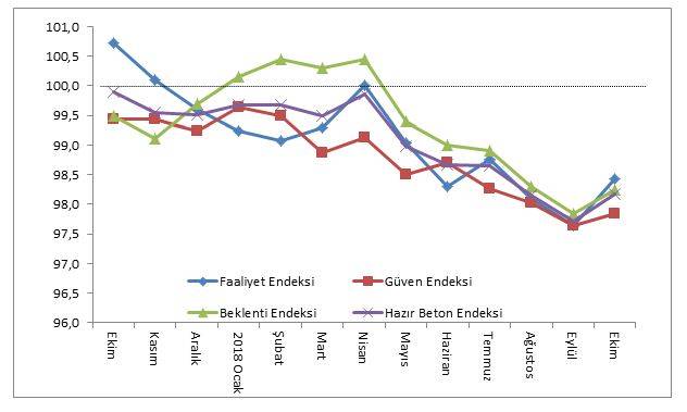 Türkiye Hazır Beton Birliğinin (THBB) hazırladığı Hazır Beton Endeksi Ekim Ayı Raporu’na göre Faaliyet Endeksi eylül ayında, bütün ayların en düşük performansını sergiledikten sonra ekim ayında toparlanmaya başladı. Yıl içindeki 5 aylık daralmadan sonra faaliyette kısmi bir hareketlilik göze çarptı. Ancak bütün endekslerin halen eşik değerin altında olması inşaatta işlerin yolunda gitmediğine işaret etmektedir. Rapor, inşaat sektörüne güvenin oldukça düşük olduğunu ortaya koydu.