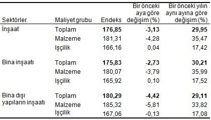 Bina inşaatı maliyet endeksi, bir önceki aya göre yüzde 2.73 düştü, bir önceki yılın aynı ayına göre yüzde 30.21 arttı. Bir önceki aya göre malzeme endeksi yüzde 3.79 düştü, işçilik endeksi yüzde 0.10 arttı. Ayrıca, bir önceki yılın aynı ayına göre malzeme endeksi yüzde 35.99, işçilik endeksi yüzde 17.52 arttı.