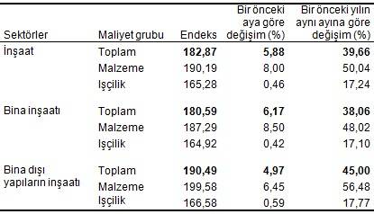 Bina inşaatı maliyet endeksi, bir önceki aya göre %6,17, bir önceki yılın aynı ayına göre %38,06 arttı. Bir önceki aya göre malzeme endeksi %8,50, işçilik endeksi %0,42 arttı. Ayrıca, bir önceki yılın aynı ayına göre malzeme endeksi %48,02, işçilik endeksi %17,10 arttı.