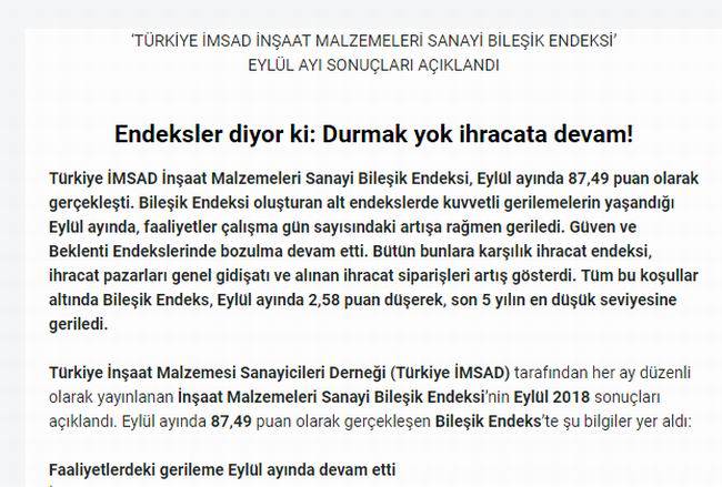 Türkiye İMSAD, Eylül ayı İnşaat Malzemeleri Sanayi Bileşik Endeksi sonuçlarını şu cümle ile basına servis etti: “Endeksler diyor ki: Durmak yok ihracata devam!”…