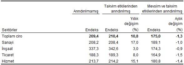 Türkiye İstatistik Kurumu (TÜİK) Aralık 2018 Ciro Endeksleri’ni açıkladı. Buna göre toplam ciro %10,8 arttı. Sanayi, inşaat, ticaret ve hizmet sektörleri toplamında takvim etkilerinden arındırılmış ciro endeksi, 2018 yılı Aralık ayında bir önceki yılın aynı ayına göre %10,8 arttı. Mevsim ve takvim etkilerinden arındırılmış toplam ciro endeksi ise bir önceki aya göre %1,3 azaldı.