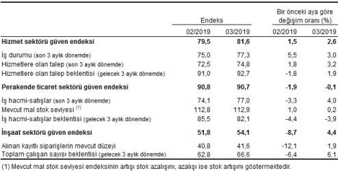 Türkiye İstatistik Kurumu (TÜİK), Mart 2019’a ait Sektörel Güven Endeksleri’ni açıkladı. İşte tablolarla detaylar…