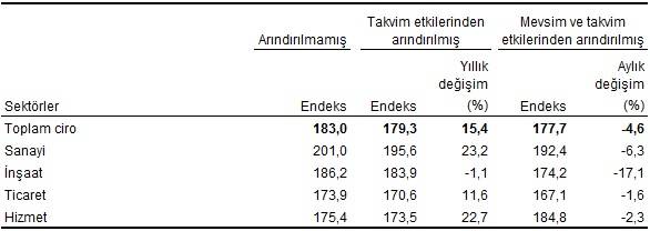 Sanayi, inşaat, ticaret ve hizmet sektörleri toplamında takvim etkilerinden arındırılmış ciro endeksi, 2018 yılı Kasım ayında bir önceki yılın aynı ayına göre %15,4 arttı. Mevsim ve takvim etkilerinden arındırılmış toplam ciro endeksi ise bir önceki aya göre %4,6 azaldı.