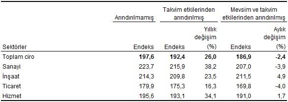 Sanayi, inşaat, ticaret ve hizmet sektörleri toplamında takvim etkilerinden arındırılmış ciro endeksi, 2018 yılı Ekim ayında bir önceki yılın aynı ayına göre yüzde 26 arttı. Mevsim ve takvim etkilerinden arındırılmış toplam ciro endeksi ise bir önceki aya göre yüzde 2.4 azaldı.