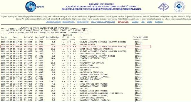 Boğaziçi Üniversitesi Kandilli Rasathanesi ve Deprem Araştırma Enstitüsü tarafından yayınlanan Son Depremler sayfasında yer alan bilgilere göre bugün İstanbul’un Marmara Denizi açıklarında ilksel nitelikli bağımsız depremler oldu.