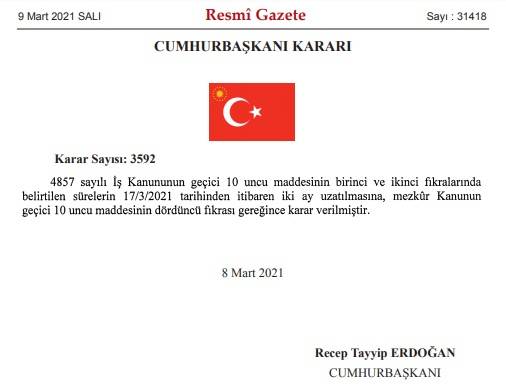 “4857 sayılı İş Kanunun geçici 10 uncu maddesinin birinci ve ikinci fıkralarında belirtilen sürelerin 17/3/2021 tarihinden itibaren iki ay uzatılmasına, mezkur Kanunun geçici 10 uncu maddesinin dördüncü fıkrası gereğince karar verilmiştir.”