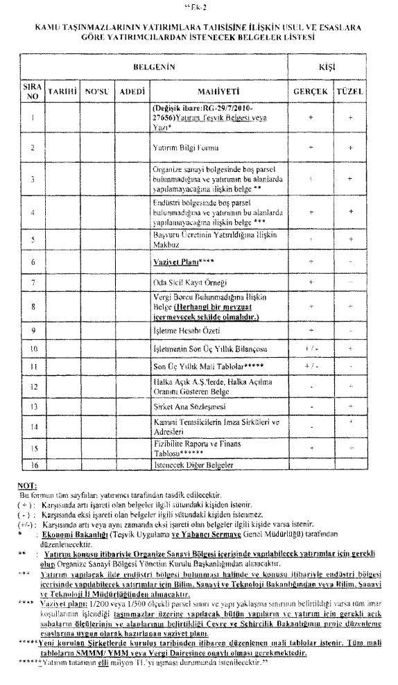 MADDE 1 – 3/9/2009 tarihli ve 27338 sayılı Resmî Gazete’de yayımlanan Kamu Taşınmazlarının Yatırımlara Tahsisine İlişkin Usul ve Esasların 6 ncı maddesinin birinci fıkrasının (a) bendi aşağıdaki şekilde değiştirilmiş, (ç) bendinde geçen “net özkaynağa” ibaresi “ve taahhüt içermeyen öz kaynağa” şeklinde, (e) bendinde geçen “on milyon” ibaresi ise “elli milyon” şeklinde değiştirilmiştir.