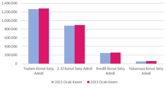 Verileri değerlendiren Endeksa.com Kurucu Ortağı ve Genel Müdürü Görkem Öğüt, “Kasım ayında konut satış adedi bir önceki aya göre artış göstermiş olsa da geçen senenin aynı ayına göre düşüş gösterdi. Ocak – Kasım dönemini değerlendirdiğimizde, geçen senenin aynı dönemine göre yüzde 1 artış olduğunu ve 1 milyon 277 bin 659 adet konut satışı gerçekleştiğini görüyoruz. Gayrimenkul sektörü, ülkemizin en önemli sektörlerinden birisi. Pandemiden pek çok sektör gibi gayrimenkul sektörü de çok etkilendi. Pandemi ile başlayan süreçte, talep artışına karşın artan üretim maliyetleri ve stok düşüklüğü sebebiyle fiyatlarda önemli artış görüldü. Endeksa verilerine göre Kasım ayı sonu itibarı ile Türkiye genelinde konut satış fiyatlarındaki değer artışı yüzde 185 seviyesinde. Artan fiyatlar sebebiyle piyasadaki düşüş beklentisi ve kredi kullandırımının kısıtlandırılması sonucu Kasım ayında satış adedi geçen seneye göre düşük gerçekleşmiş olsa da gayrimenkulün önemini koruduğunu görüyoruz.” dedi.