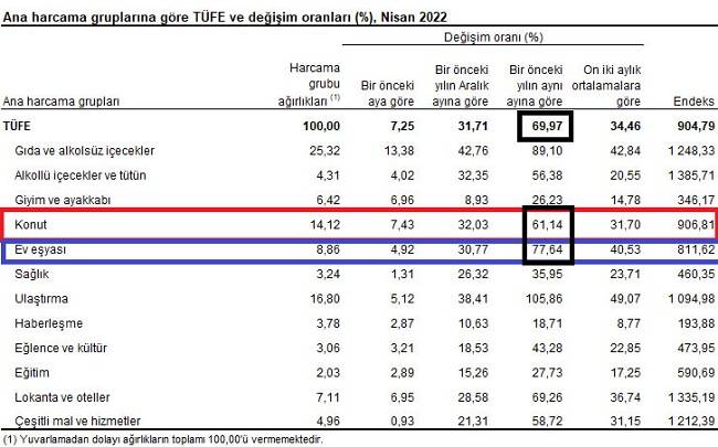 TÜİK verilerine göre TÜFE’de (2003=100) 2022 yılı Nisan ayında bir önceki aya göre yüzde 7.25, bir önceki yılın Aralık ayına göre yüzde 31.71, bir önceki yılın aynı ayına göre yüzde 69.97 ve on iki aylık ortalamalara göre yüzde 34.46 artış gerçekleşti.