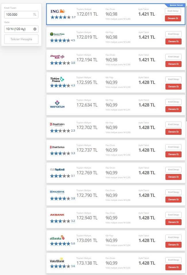 AlBaraka‘dan alınacak 100 bin TL konut kredisinin kâr payı oranı yüzde 0.99 (Yıllık maliyet oranı yüzde 13.04), aylık taksit tutarı 1.428 TL olan kredinin toplam maliyeti 173 bin 091 TL,