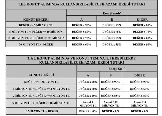 Değeri 5 milyon lira ile 10 milyon lira arasındaki ikinci el konutlarda 2,5 milyon lira ila 3 milyon lira tutarında kredi kullanılabilirken, 10 milyon lira üzerindeki ikinci el konutlar için kredi kullanılamayacak.