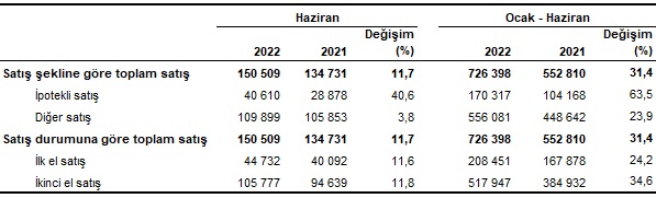Toplam konut satışları içinde ipotekli satışların payı yüzde 27.0 olarak gerçekleşti. Ocak-Haziran döneminde gerçekleşen ipotekli konut satışları ise bir önceki yılın aynı dönemine göre yüzde 63.5 artışla 170 bin 317 oldu.
