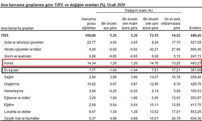 TÜİK Ocak 2020 enflasyon rakamlarını açıkladı. TÜİK'e göre yıllık enflasyon yüzde 12.15 olarak belirlendi. Peki Ocak 2020 itibariyle konut sektöründeki enflasyon oranı yüzde kaç? Ev eşyasında enflasyon ne kadar? İşte konut ve ev eşyasında enflasyon oranı...