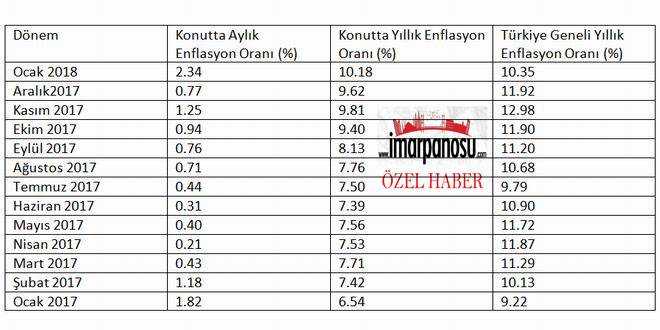 Konutta aylık ve yıllık fiyat artışı ile ülke geneli yıllık enflasyon dengesi; imarpanosu.com’un derlediği bilgilere göre şöyle gerçekleşti.