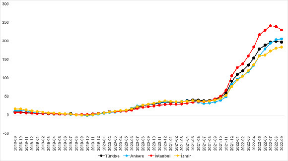 İlan satış fiyatları Eylül ayında da geçen yılın aynı ayına kıyasla bütün büyükşehirlerde arttı. Satılık konut m2 fiyatlarında en hızlı artışın görüldüğü iller Mersin (yüzde 239,8), İstanbul (yüzde 229,4), Antalya (yüzde 229), Kocaeli (yüzde 222,1) ve Trabzon (yüzde 196,1) oldu. En düşük artışlar ise Eskişehir (yüzde 159,1), Manisa (yüzde 156,7), Kayseri (yüzde 154,1), Muğla (yüzde 147,7) ve Erzurum’da (yüzde 145,8) görüldü.