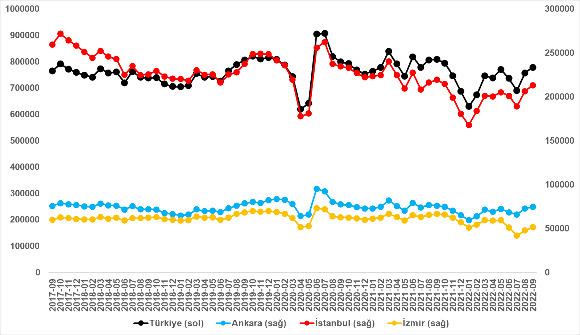 Cari fiyatlardaki yıllık artış oranının Ankara ve İzmir’de yavaşladığı gözlendi. Ankara’da yıllık artış oranı Ağustos’tan Eylül’e yüzde 203,3’ten 205,6’a, İzmir’de yüzde 180,4’ten 183,1’e yükseldi. Öte yandan, Ağustos’ta İstanbul’da yıllık cari fiyat artış oranı yüzde 238,8’den 229,4’e geriledi. İstanbul’da bir ayda yıllık fiyat artış oranında 9,4 puanlık düşüş kaydedildi. Satılık konut ilan m2 ortalama fiyatları İstanbul’da 20.588 TL’ye, Ankara’da 9.307 TL’ye ve İzmir’de 15.455 TL’ye yükseldi.