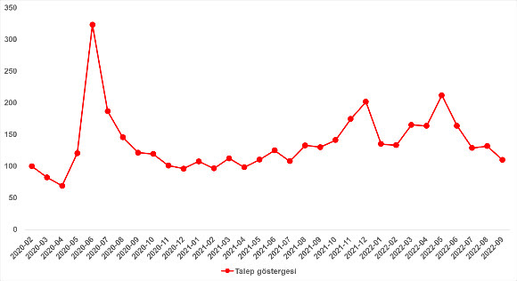 Konut talebi, Haziran ve Temmuz aylarındaki düşüşün ardından Ağustos’ta bir miktar yükselse de Eylül ayında da düşüş kaydetti. Konut talebi endeksi geçen aya kıyasla yüzde 16,7 azalarak 109,6 oldu. Bununla birlikte konut talebi geçen yılın Eylül ayına kıyasla yüzde 15,7 düştü. Talep göstergesi Mayıs’tan itibaren aşağıya yönelirken, göstergenin Mayıs ayındaki seviyesine kıyasla yüzde 48,3 daha düşük, Şubat 2020’ye kıyasla ise sadece yüzde 9,6 daha yüksek olduğu görüldü. Eylül’de açıklanan sosyal konut projesi ve ofislerin konutlara dönüştürülmesi projesinin konutların reel satış fiyatlarındaki artışı durduracağına dair oluşturduğu beklentinin ardından taleplerde düşüşün yaşandığı tahmin ediliyor.
