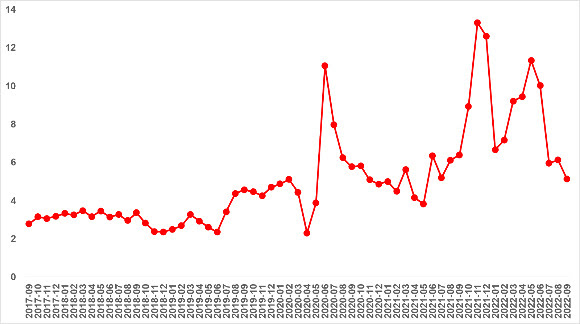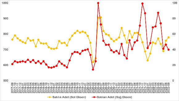 Satılan konut sayısının toplam satılık ilan sayısına oranı Haziran ve Temmuz aylarında görülen belirgin düşüşün ardından Ağustos ayında bir miktar yükseldi. Bu oran Eylül’de bir önceki aya kıyasla 1 puan azalarak yüzde 5,1 oldu. Satılık ilan sayısı önceki aya göre yüzde 2,8 (756.805’ten 778.180’e) yükselirken, satılan konut sayısı ise yüzde 14 (46.373’ten 39.856’ya) oranında düştü. Satılan konut sayısı Haziran’da önceki aya göre 13.361, Temmuz’da ise önceki aya göre 32.621 azalmıştı. Satılan konut sayısı Ağustos’ta bir miktar artsa da Eylül’de bir önceki aya kıyasla 6.507 düştü. Satılan konut sayısı Mayıs ayına kıyasla yaklaşık 47 bin düştü.