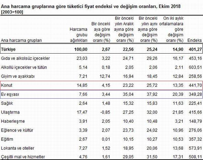 TÜİK’in açıklamasına göre; TÜFE’de (2003=100) 2018 yılı Ekim ayında bir önceki aya göre yüzde 2.67, bir önceki yılın Aralık ayına göre yüzde 22.56, bir önceki yılın aynı ayına göre yüzde 25.24 ve on iki aylık ortalamalara göre yüzde 14.90 artış gerçekleşti.