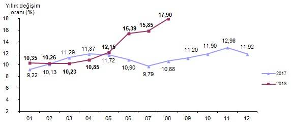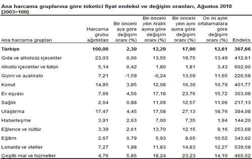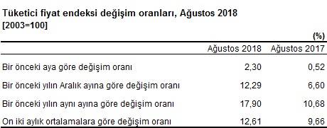 TÜİK tarafından yapılan açıklama şöyle: TÜFE’de (2003=100) 2018 yılı Ağustos ayında bir önceki aya göre %2,30, bir önceki yılın Aralık ayına göre %12,29, bir önceki yılın aynı ayına göre %17,90 ve on iki aylık ortalamalara göre %12,61 artış gerçekleşti.